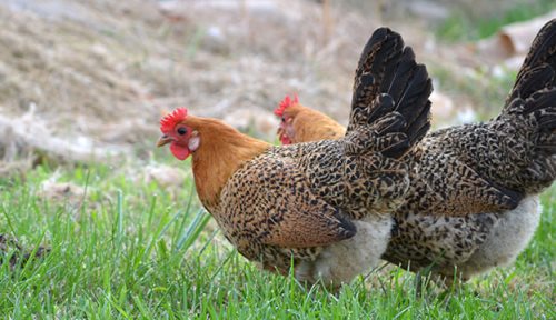 Colors: Roosters and hens are markedly different in coloring. The males have black tail feathers, and are a rich, reddish-golden color, while females have a base color of golden buff, with black spangles. They have yellow skin, white ear lobes, and red combs and wattles.
